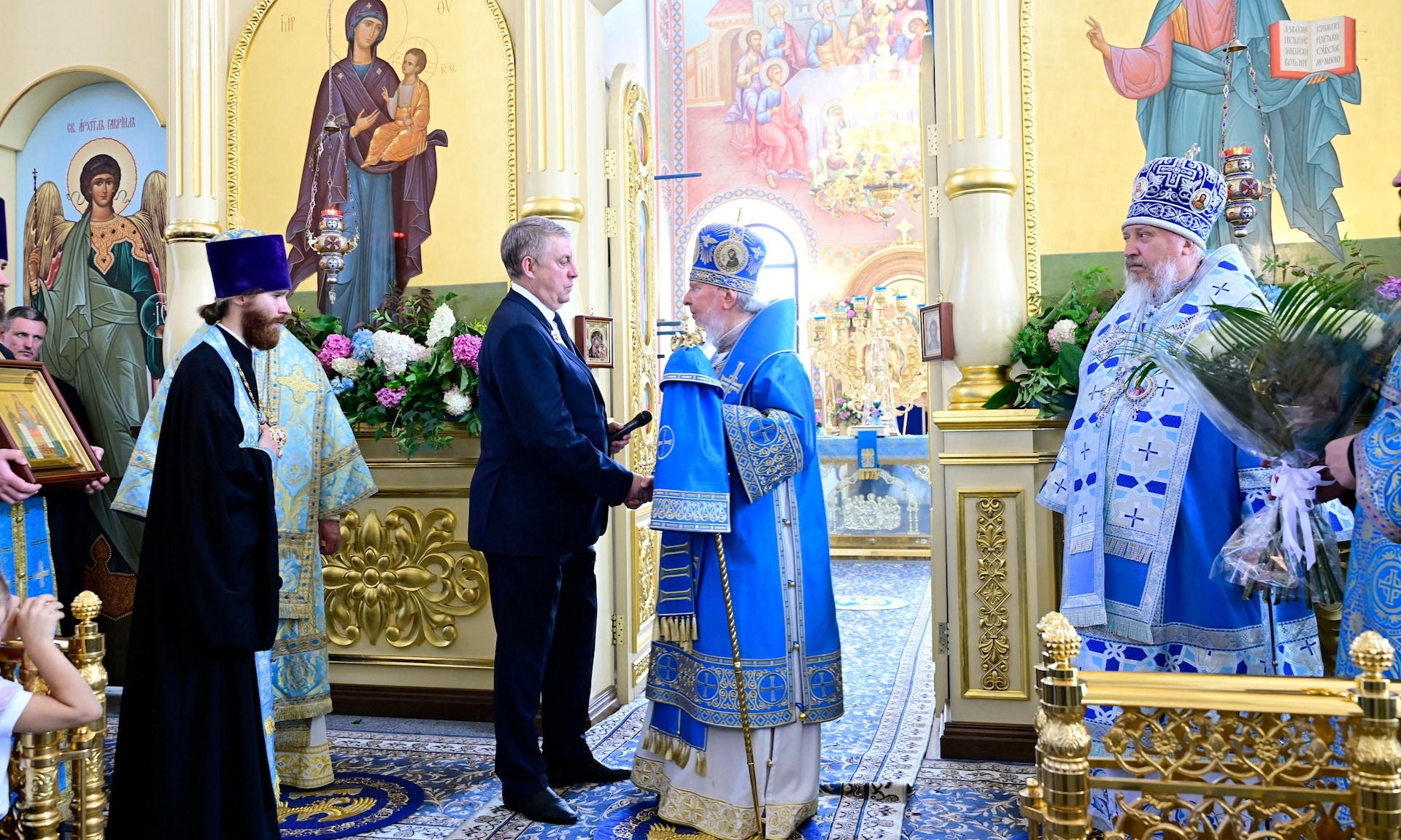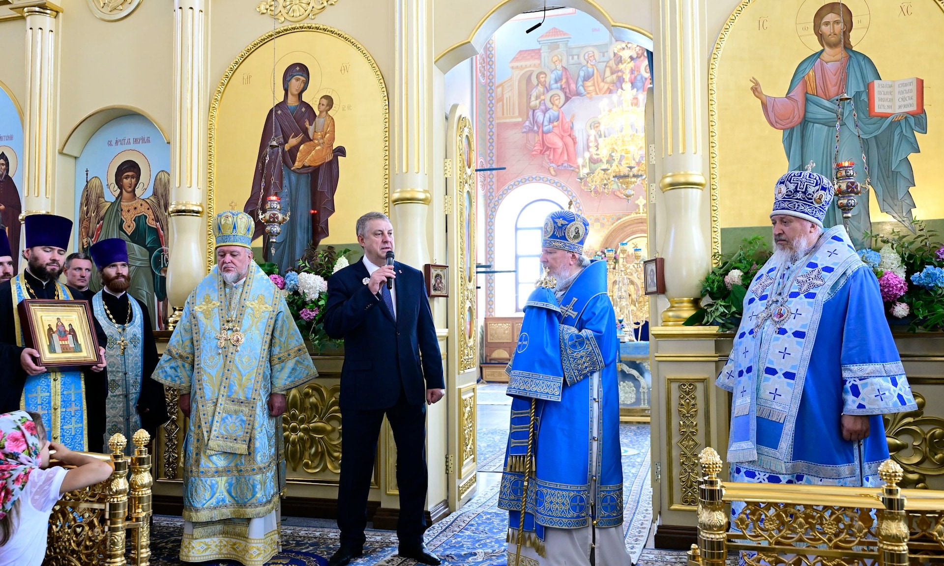 В этот день особые слова благодарности хотел бы выразить Вам, уважаемый Александр Васильевич, за вклад в восстановление Успенского собора, за попечение о храмах, которые сейчас строятся и возрождаются, за внимание к отеческой православной вере и к укреплению традиционных ценностей на родной и дорогой Вашему сердцу Брянщине. Ваши усердные труды были отмечены Святейшим Патриархом Кириллом и от его имени позвольте Вам вручить высокую патриаршую награду.