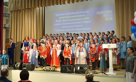 Музыкальное приветствие для гостей в обновленном концертном зале исполнили детский фольклорный ансамбль «Лукошко», учащиеся ДШИ № 10 и хоры.